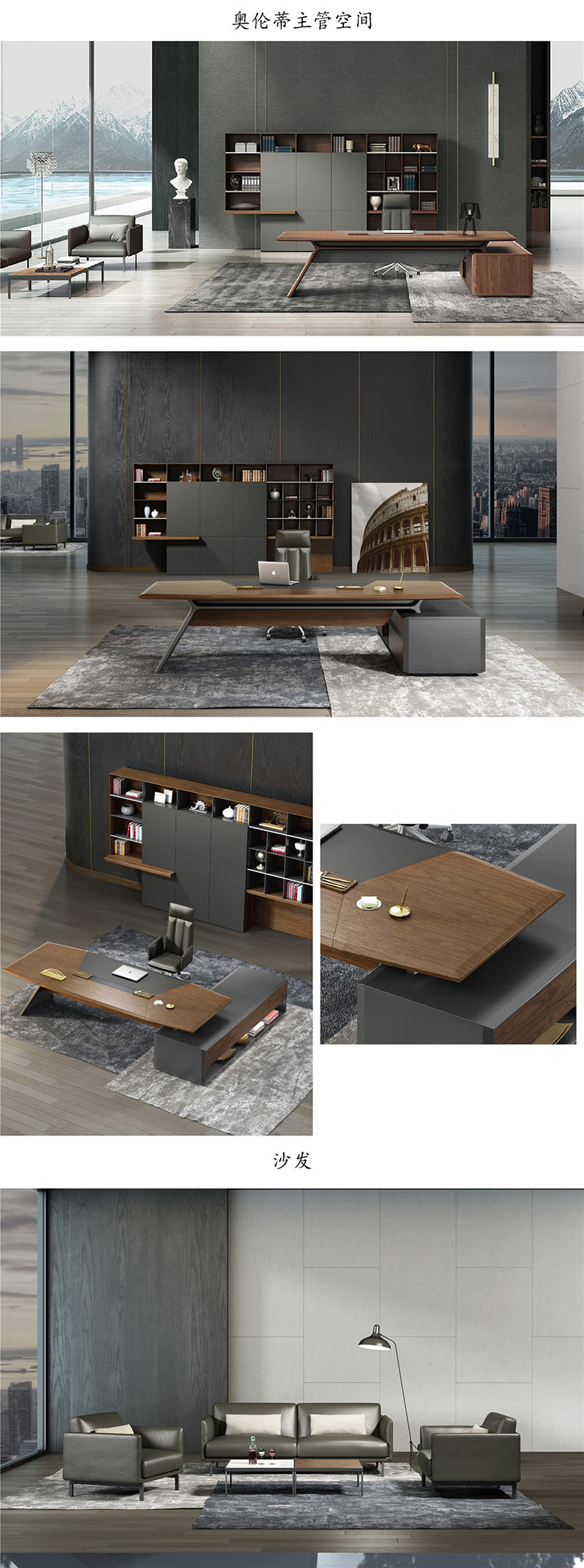 斜腳的形態(tài)剛中帶柔,輪廓張力十足,曲線細膩優(yōu)雅——是力與美的展現!中性色木紋、流星灰油漆與暗啞的皮質搭配——鋪陳高級質感!臺面采用木皮3D吸附工藝實現全包圍曲面——斜面過度自然!